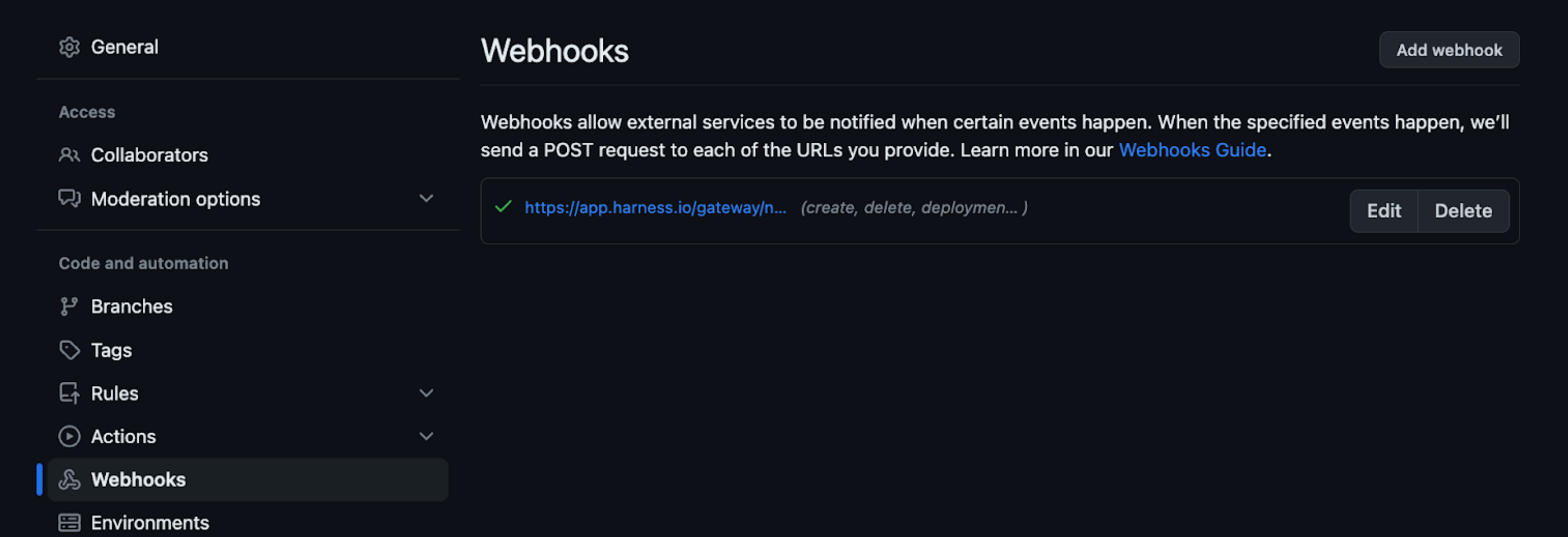 Once the webhook is auto-created in your GitHub repository, Harness will receive Git events from the webhook to initiate pipeline execution.