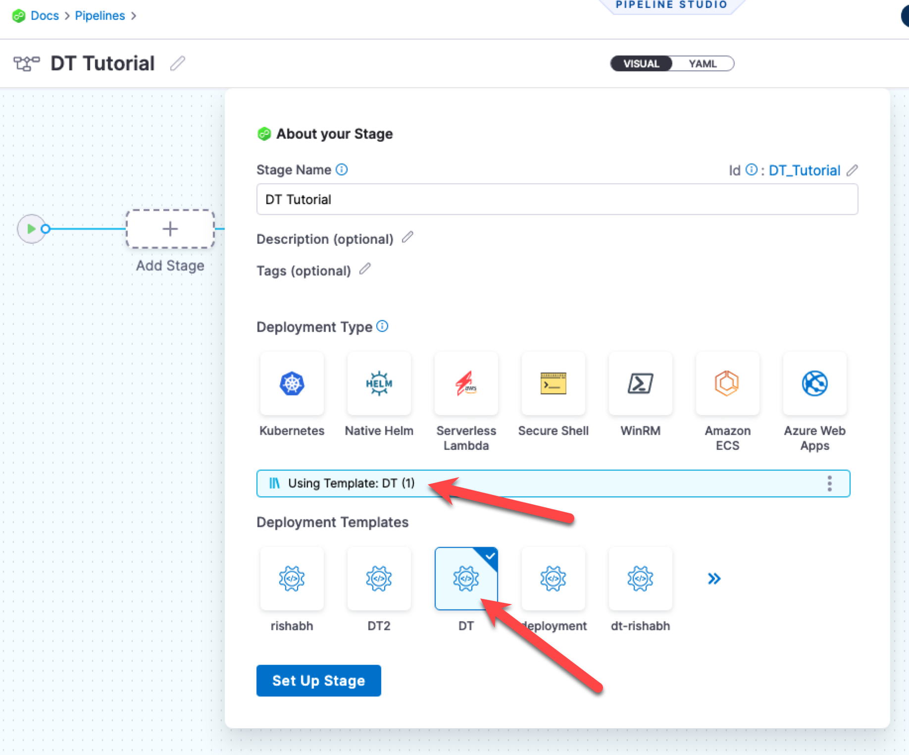 - Create a Harness Pipeline stage using the Deployment Template type and the Deployment Template.
