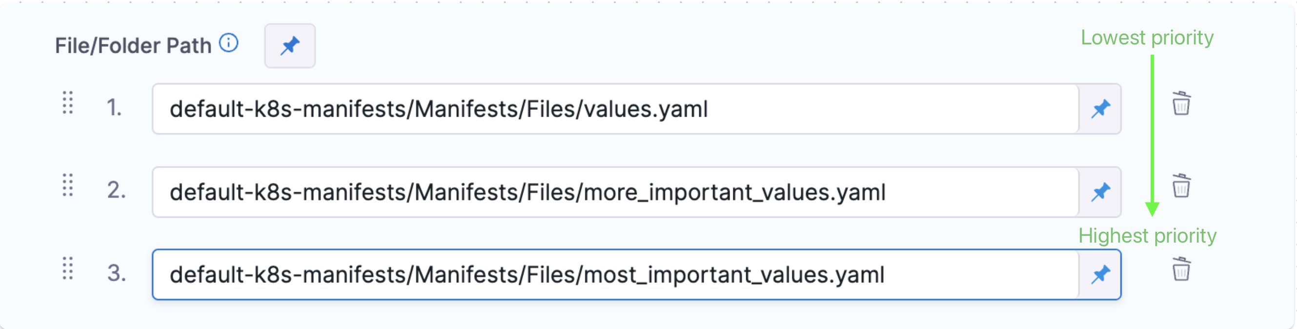 If you use multiple files, the highest priority is given from the last file, and the lowest priority to the first file. For example, if you have 3 files and the second and third files contain the same key:value as the first file, the third file's key:value overrides the second and first files.