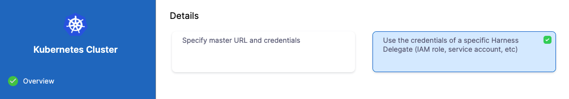 Select the Kubernetes Delegate you added earlier using its Tags, and then select Save and Continue. Harness verifies the Connector.