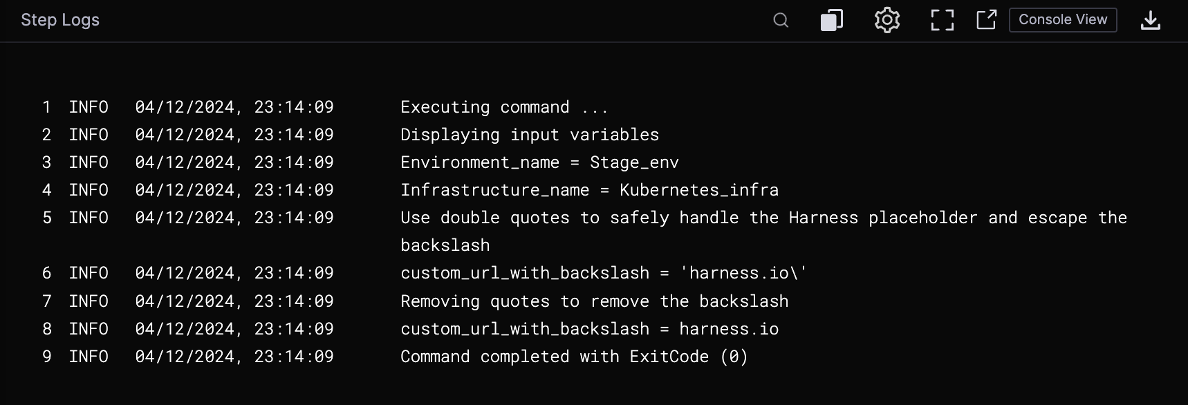 The color codes that Harness uses for shell script logs is aligned with the I/O stream from the executed command. Typically, stdout is used for logging successful commands, with its logs color-coded to represent informational data. Conversely, stderr is generally used for error logging, with logs color-coded accordingly. However, note that some commands also output successful executions to stderr, and that Harness cannot control this variance in I/O stream usage.