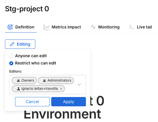 • Staging: No environment level permissions are set. This means that, by default, any user can edit any object. An owner of the object (or admin) can click on the Permissions toggle to set permissions for that object to on. If that happens, only owners and admins can edit the object. An owner or admin can add additional editors by either adding a user or group as an owner or as an editor. Editors can also be removed.