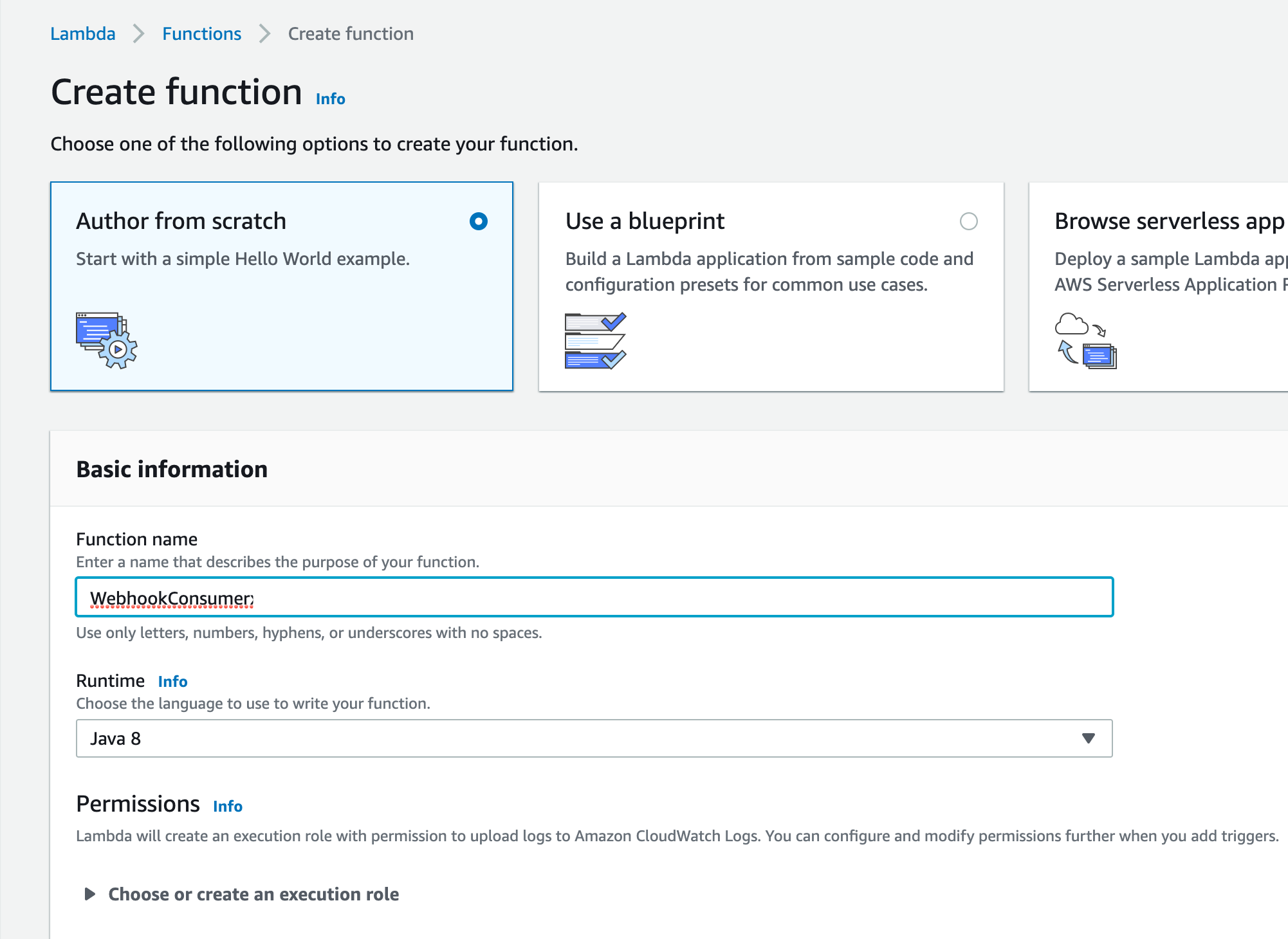 8. The Second service needed is AWS Lambda, select AWS > Lambda, click on the Create function button, choose the Author from scratch option, and use Java 8 for the runtime engine.