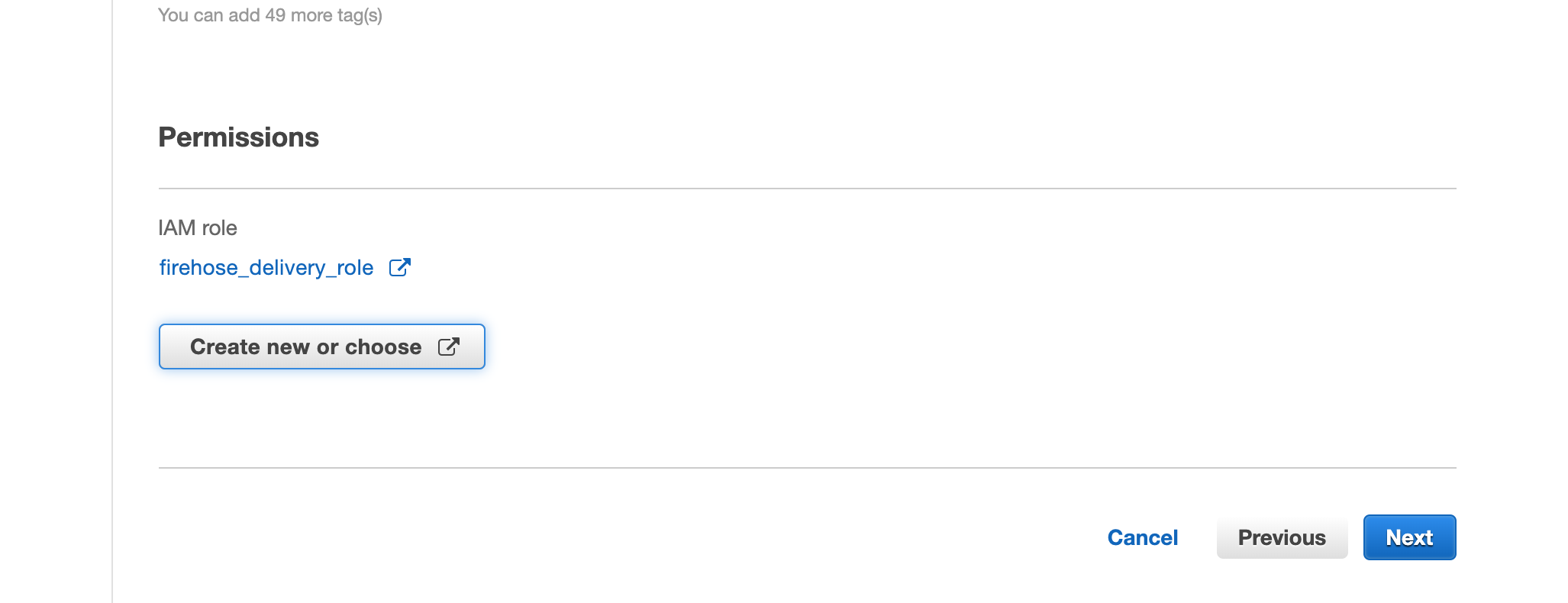 7. Select the IAM Role needed to access the service, consult with an AWS expert for more info, in this example, we used a role that has AmazonKinesisFullAccess and AmazonKinesisFirehoseFullAccess policy, click Next, then click Create delivery stream.