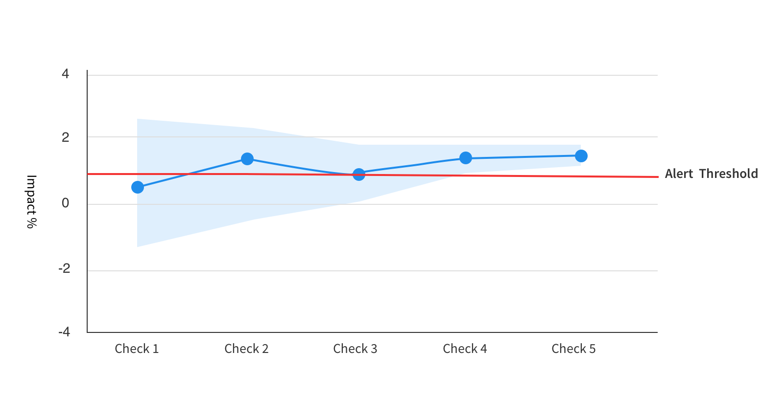 The reason no alert fires in these earlier checks is because the error margin, or confidence interval, on the impact is too wide to be confident that the impact really is greater than your threshold. However for the fourth and fifth checks, an alert would fire.
