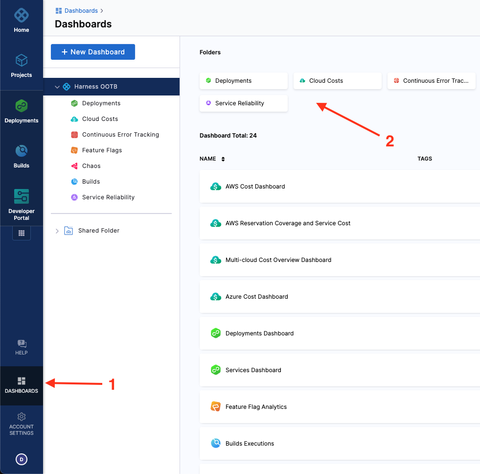To view and access dashboards, select DASHBOARDS from the left navigation in your Harness account. You can filter the data on the dashboards for IDP module by selecting the module name from the top of the page.
