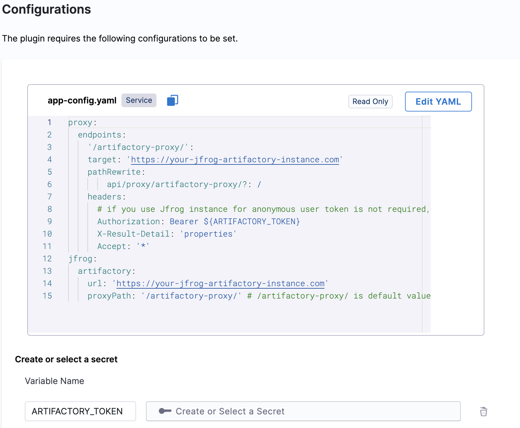 • Under the Plugins tab in Admin, go to app-config.yaml and Edit YAML to configure your JFrog endpoint in the target field and add your artifactory URL (used for UI browse links) in the format as shown below.