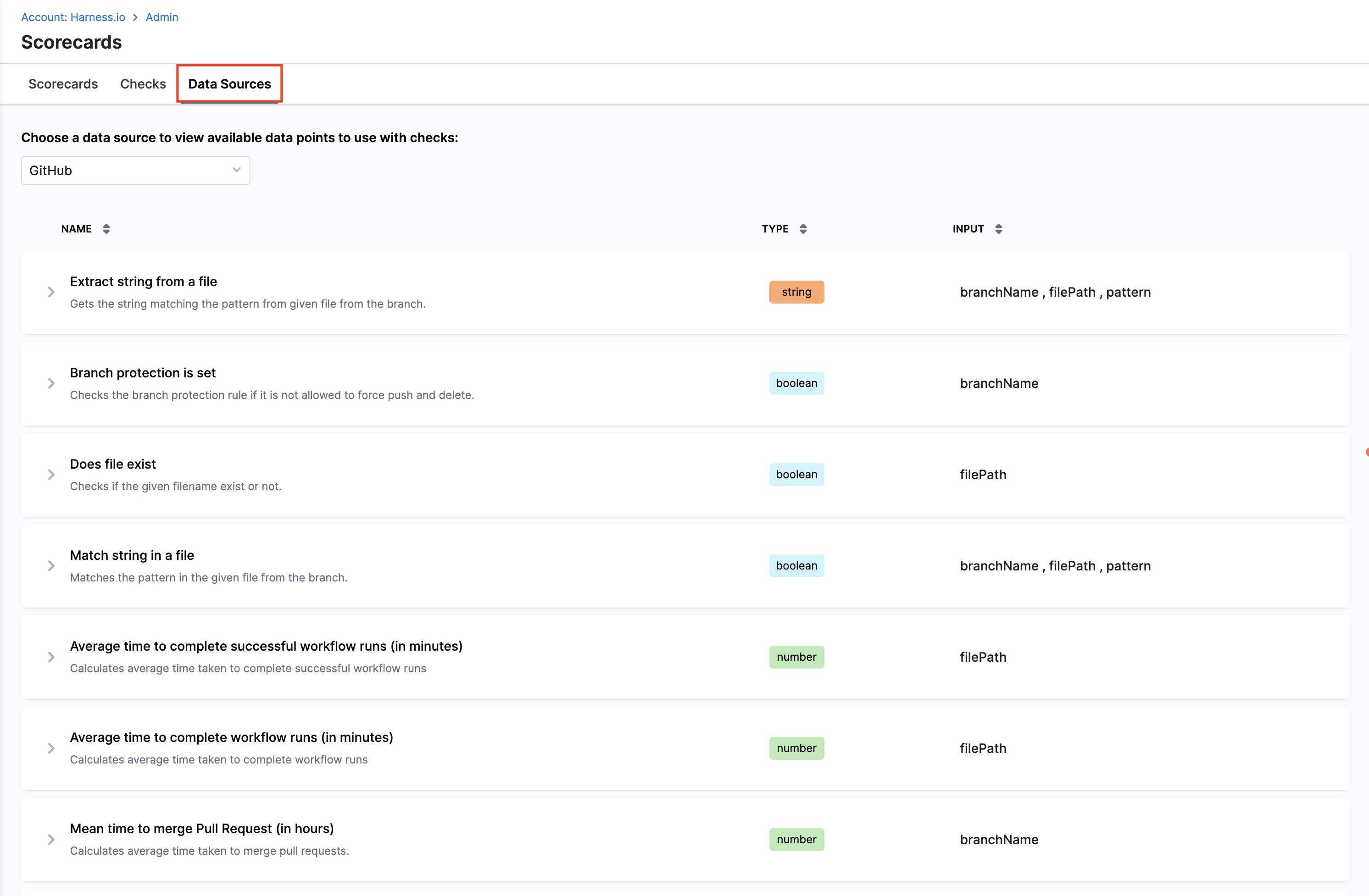 Harness IDP allows you to integrate various data sources to collect specific data points for each software component. Once a data source is enabled, you can use it to create checks for your scorecards.
