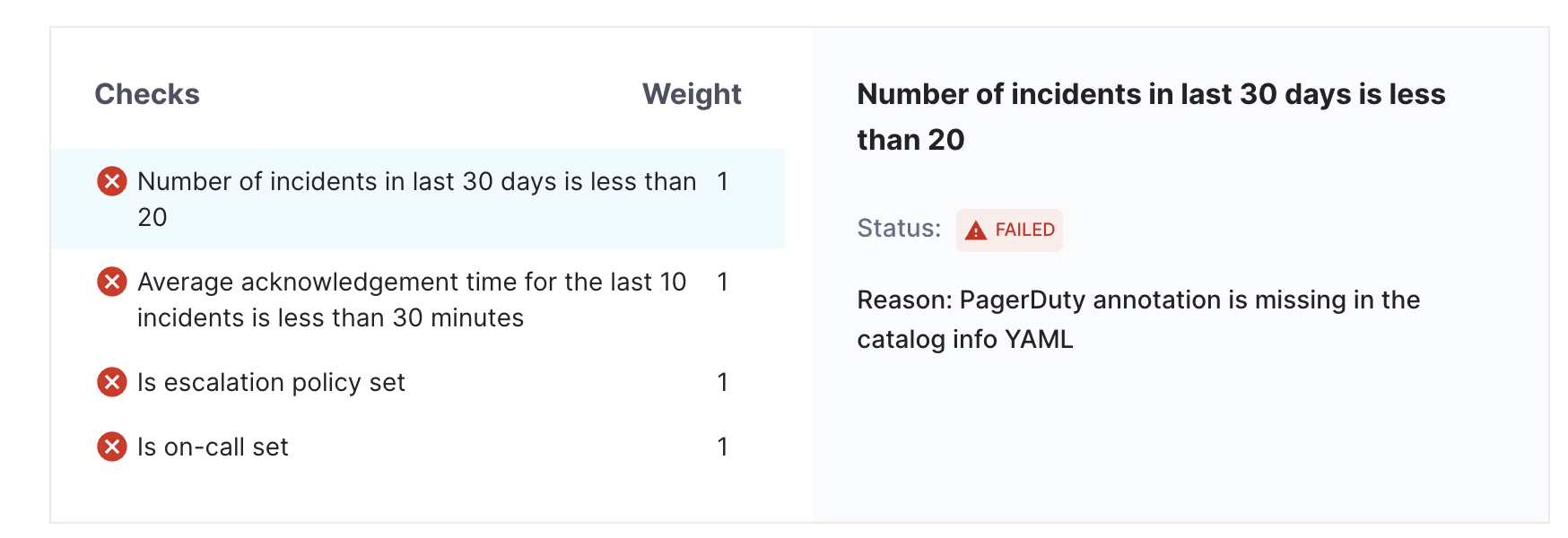 Missing PagerDuty Annotation: If the PagerDuty annotation is missing from the catalog-info.yaml file, the check will fail with an error message indicating that the annotation is required.