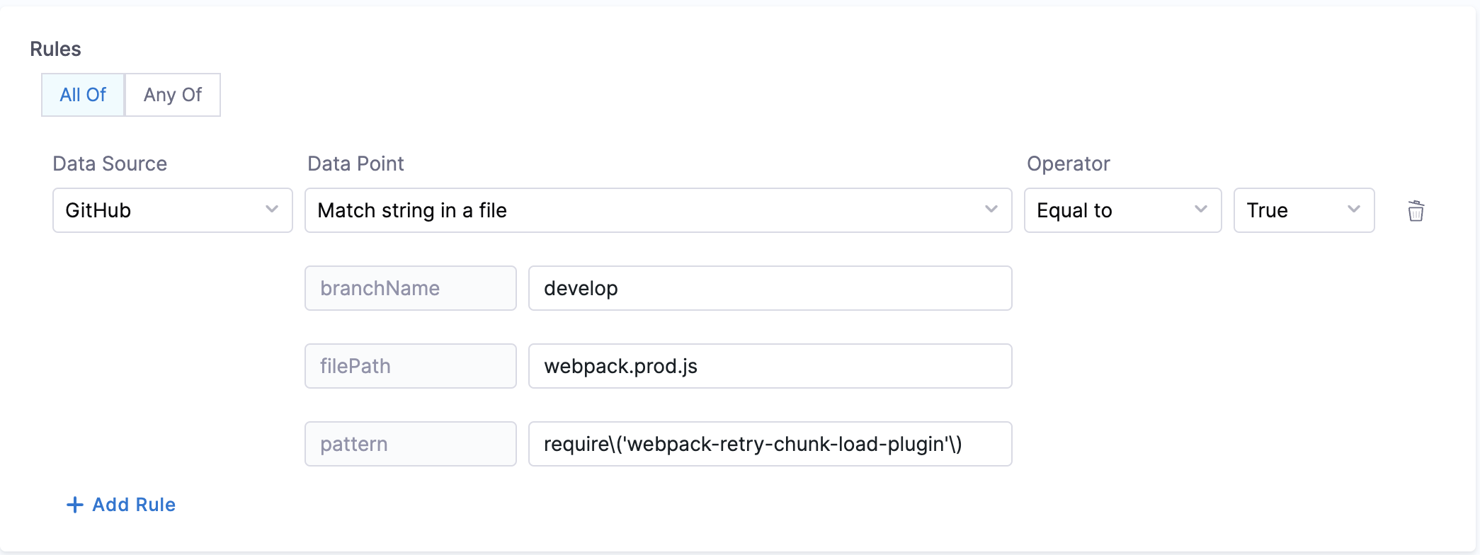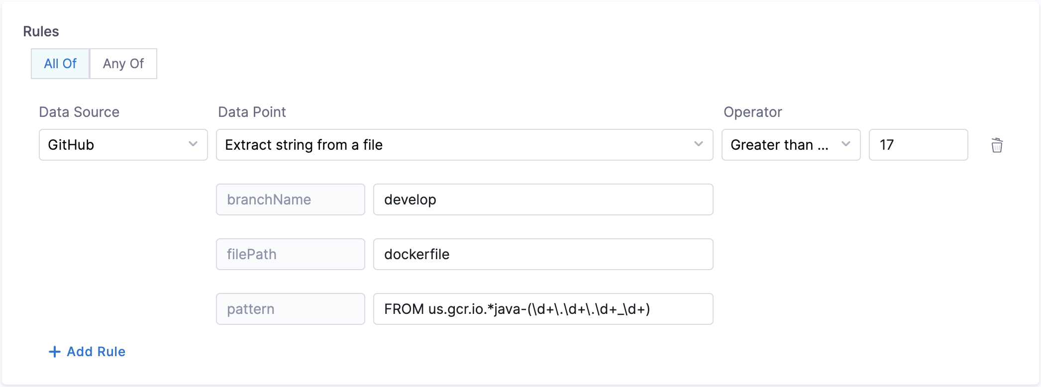 Calculation Method: If a branch name is specified, it is utilized. However, if no branch name is provided, the system retrieves information from the catalog YAML file using the backstage.io/source-location annotation to determine the branch name and repository details. It is essential to specify the filename with its extension or provide the relative path from the root folder (e.g., README.md or docs/README.md) in the conditional input field. After fetching the file, the contents are examined to find the pattern. Returns true/false based on whether the pattern was found or not.