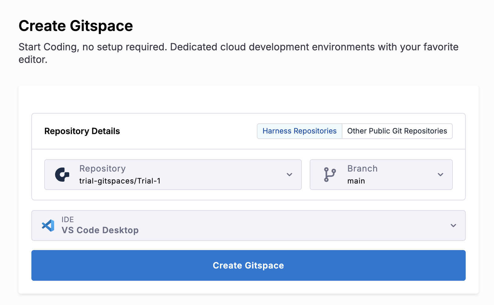 1. Start by creating a Gitspace in your Harness Open Source UI.