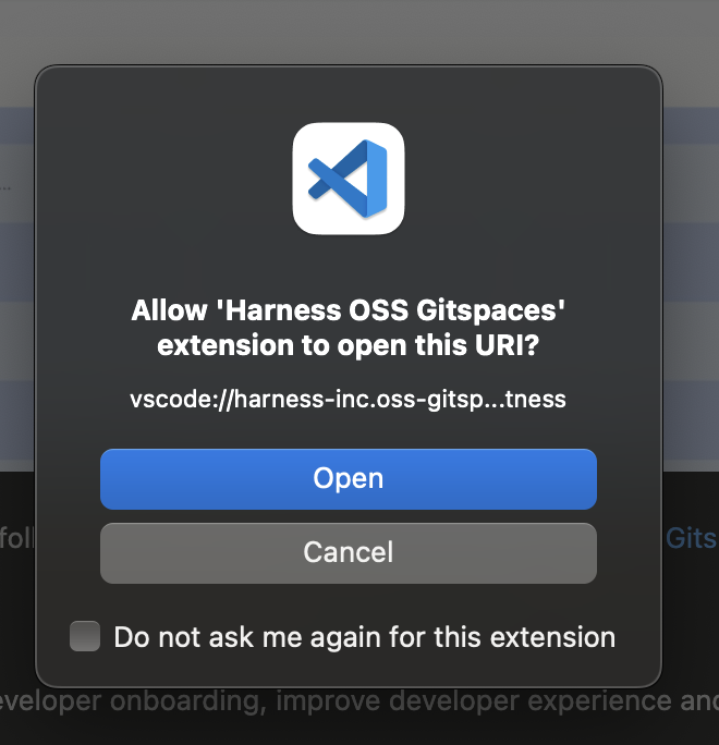 4. You’ll be prompted to open the Gitspace inside your VS Code IDE. Click “Open.”