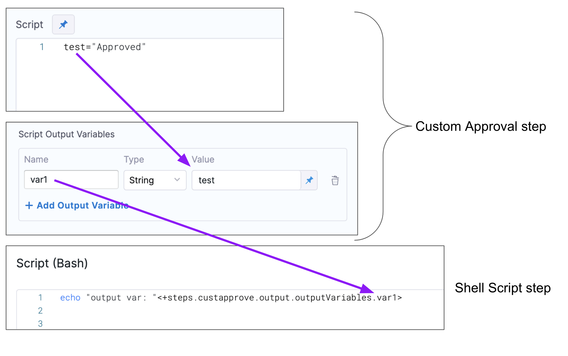 You can also use expressions in Value. For example, if you have an Output Variable from a previous Custom Approval or Shell Script step, you can copy it from the executed step Outputs.