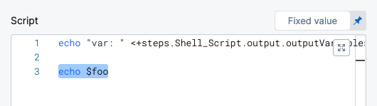 To find the expression to reference your output variables, execute the pipeline, locate the step, and click its Output tab. You can copy the Output variable there.