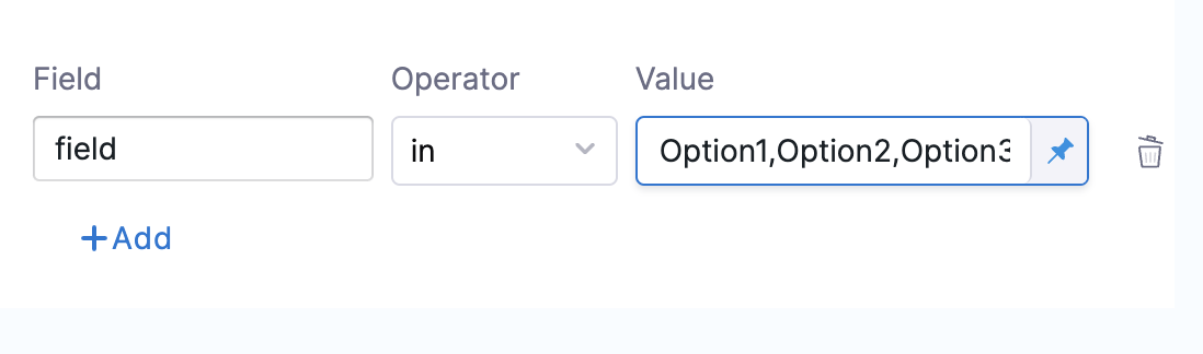 Multiple conditions with the same Field are not allowed. Such use cases can be solved using in, not in operators, or JEXL Expression.
