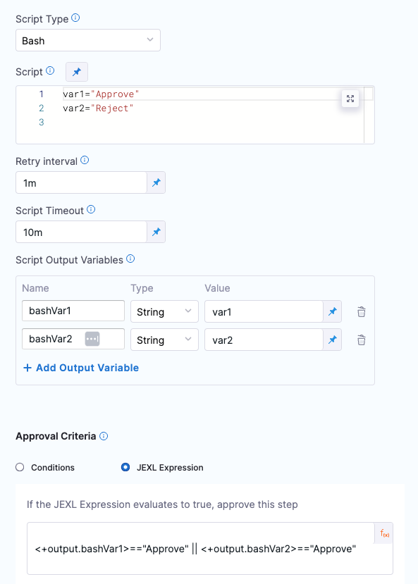 • For example, you could evaluate the output from a previous Shell Script step named test by referencing its output in a JEXL expression and comparing it to the value Approved: <+execution.steps.test.output.outputVariables.status>=="Approved".