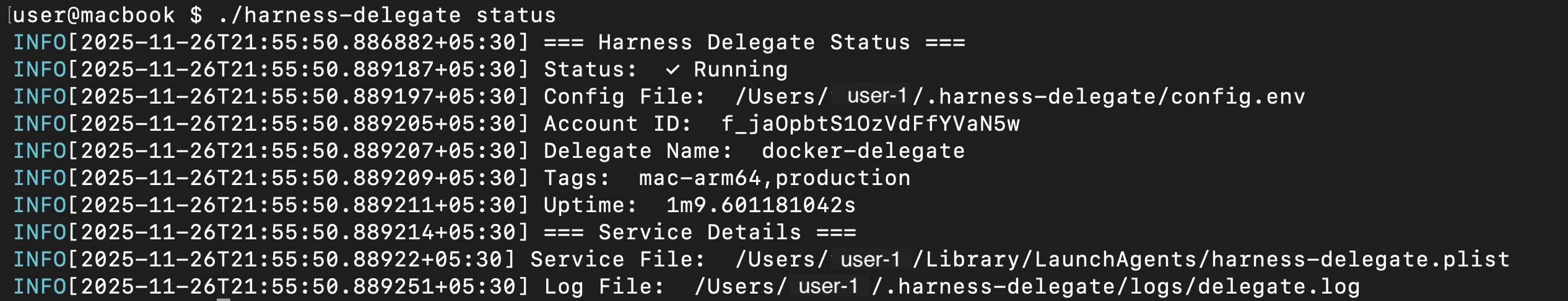 | MacOS | ~/.harness-delegate/config.env | ~/.harness-delegate/logs/ | ~/Library/LaunchAgents/harness-delegate.plist |