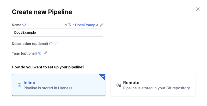 You can also store your configurations in Harness, by selecting the Inline option while creating resources. For more information on creating an inline pipeline, see Pipelines and Stages.