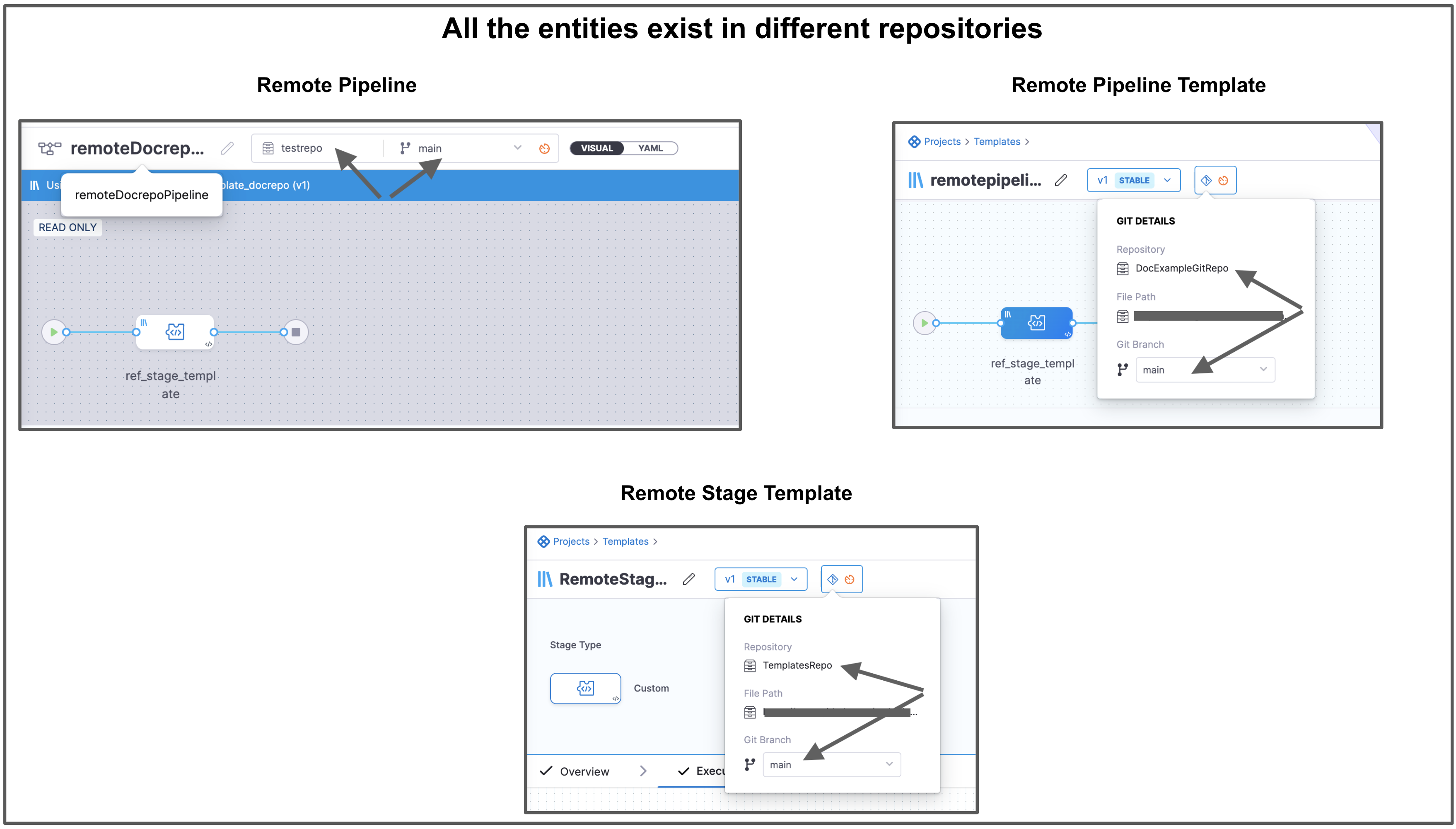 There is a pipeline remoteDocrepoPipeline that references a remote pipeline template named remotepipelinetemplate_docrepo. This remote pipeline template references a remote stage template named RemoteStageTemplate. These 3 entities are in different Git repos.