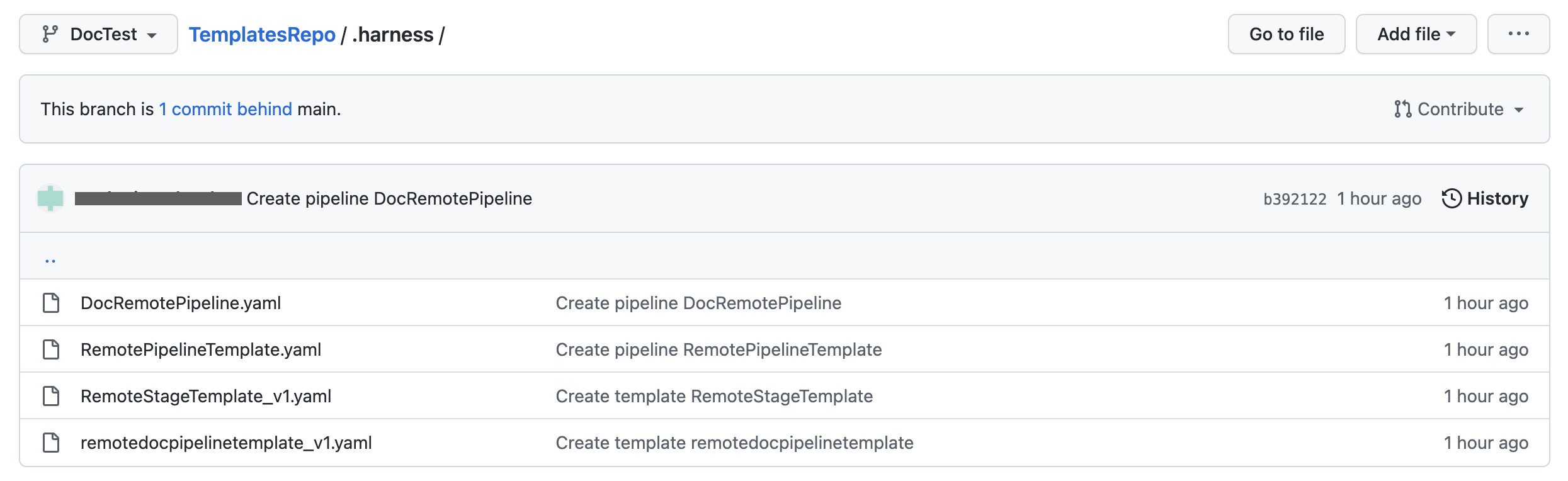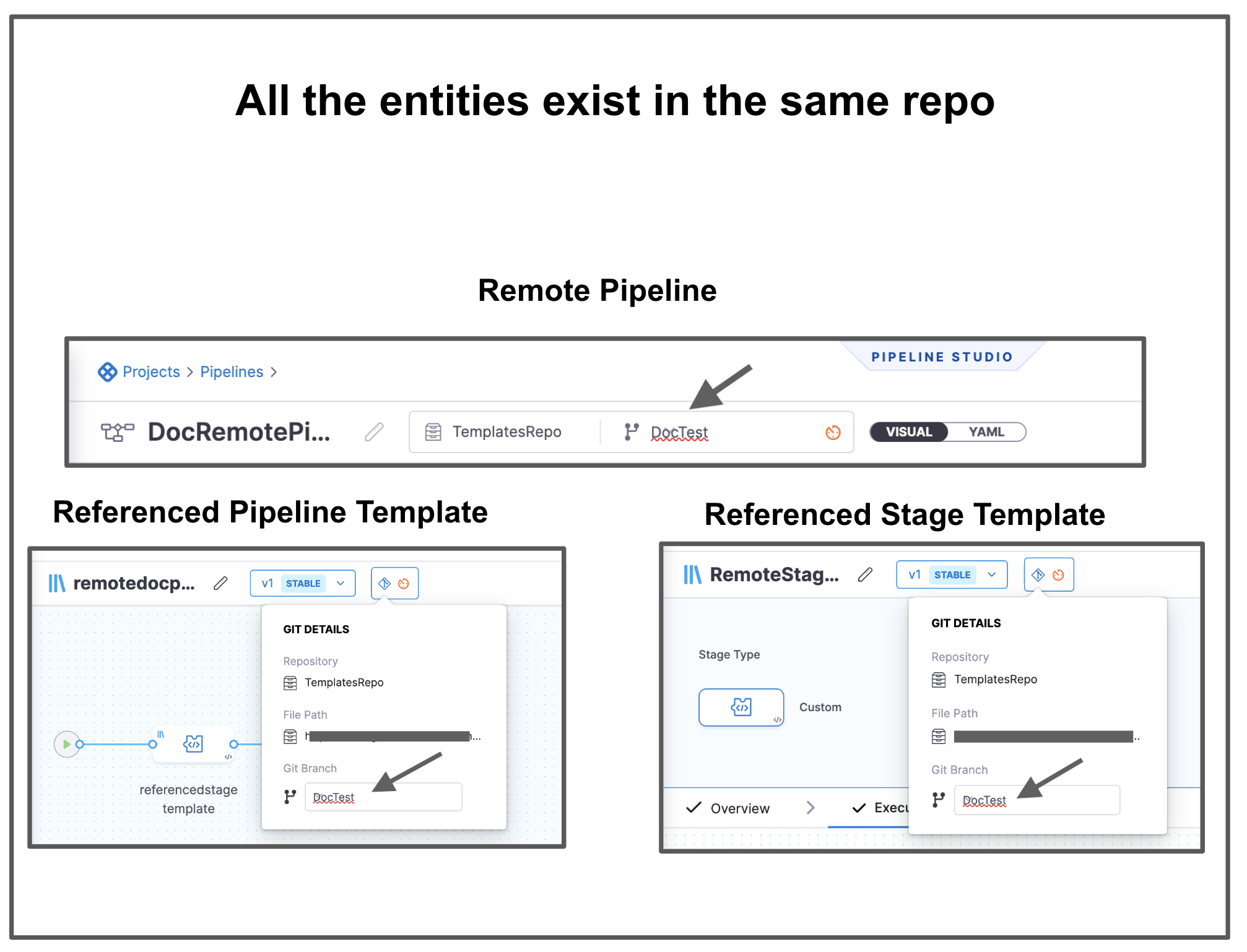 There is a pipeline DocRemotePipeline that references a remote pipeline template named remotedocpipelinetemplate. This remote pipeline template references a remote stage template named RemoteStageTemplate. These 3 entities are in the same Git repo.