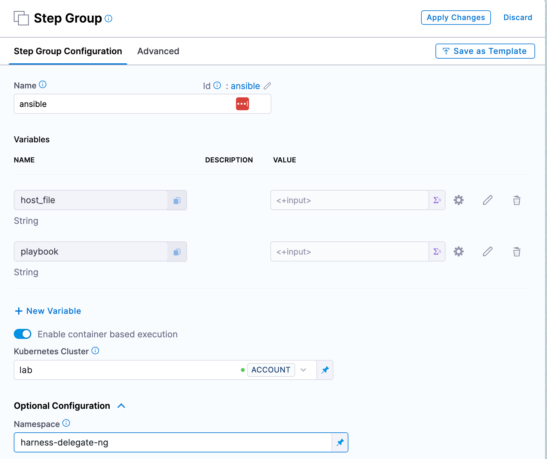 ansible-playbook --private-key=id_rsa -i <+execution.steps.ansible.variables.host_file> <+execution.steps.ansible.variables.playbook>