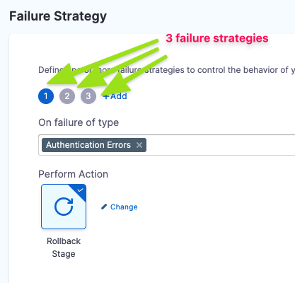4. To add an additional stage failure strategy, select Add, and then configure the failure strategy settings: