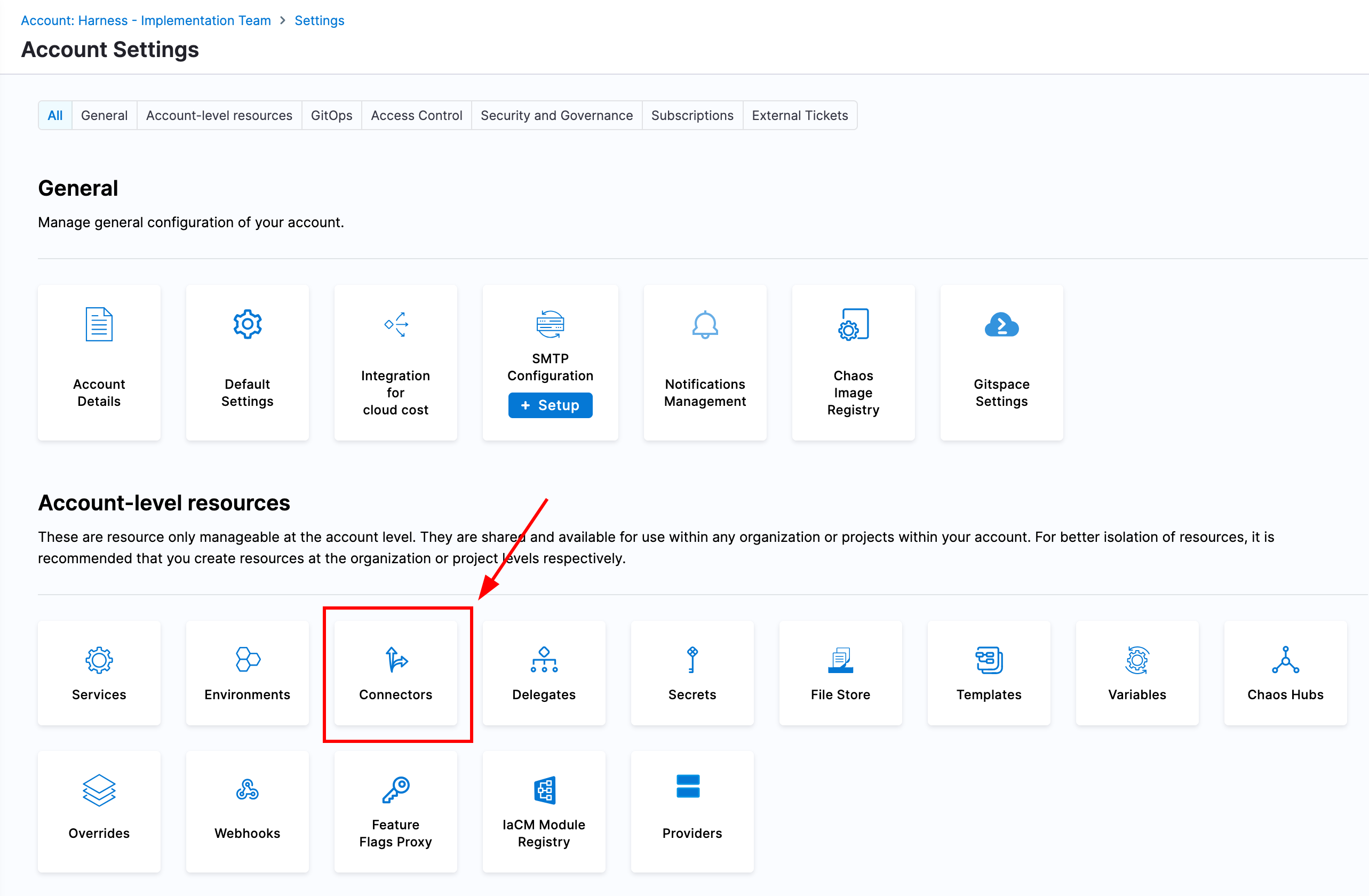 Connectors in Harness contain the information necessary to "connect" to external systems. In order to execute a pipeline, we will need a Kubernetes connector which defines how Harness can access a Kubernetes cluster where it can create pods to execute the pipeline. We will create a new Kubernetes connector that leverages the delegate we deployed as the method for gaining access to the Kubernetes API.