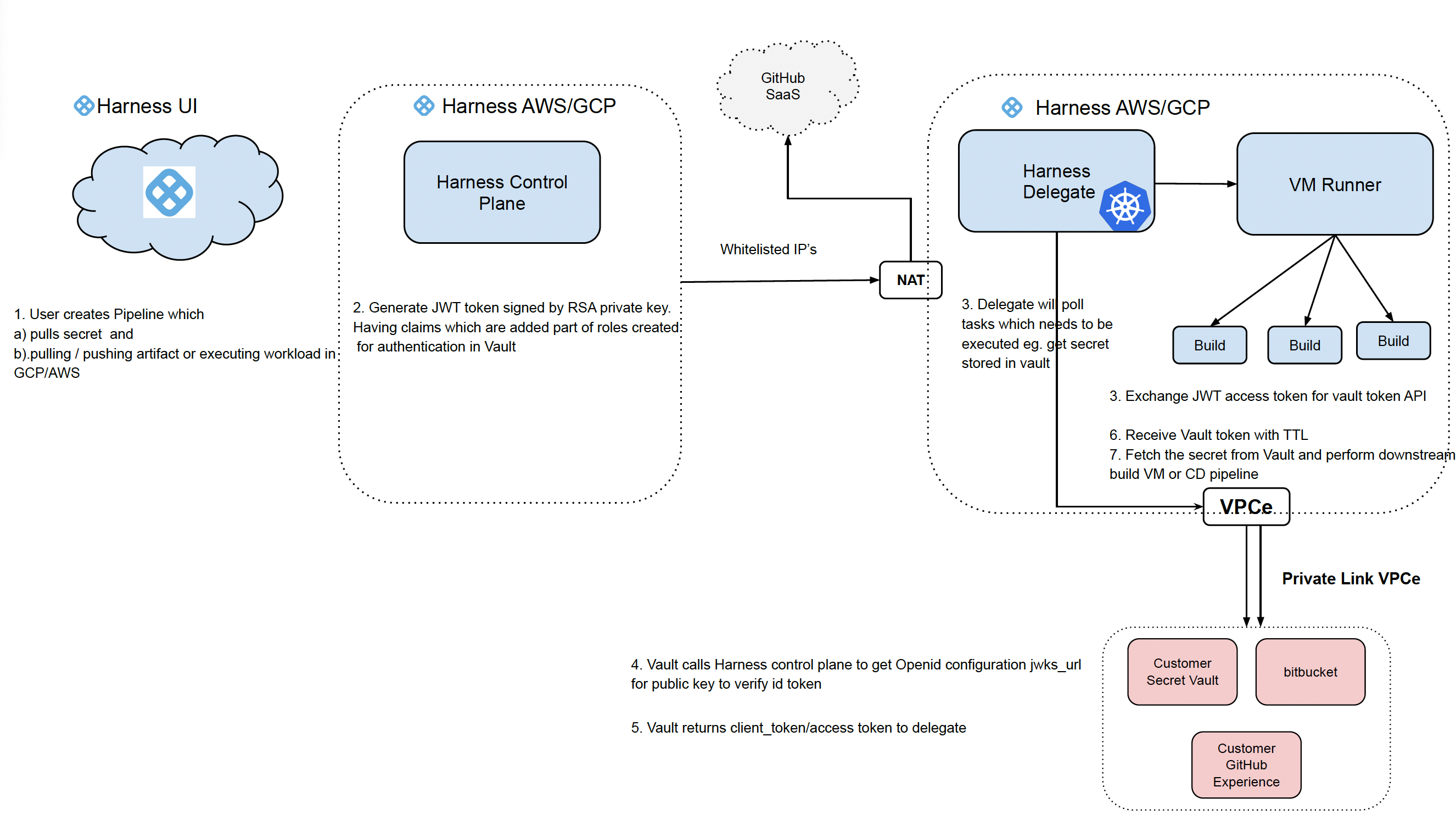 Harness Cloud can securely access services inside your private cloud (like GitHub Enterprise, Bitbucket Server, Artifact registries, internal APIs) over AWS PrivateLink or GCP Private Service Connect instead of the public internet.