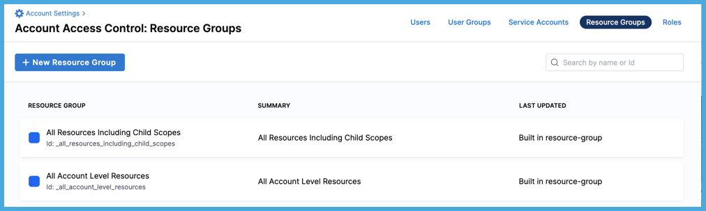 Harness includes some built-in resource groups, and you can create custom resource groups, which are useful for limited and fine-grained access control.