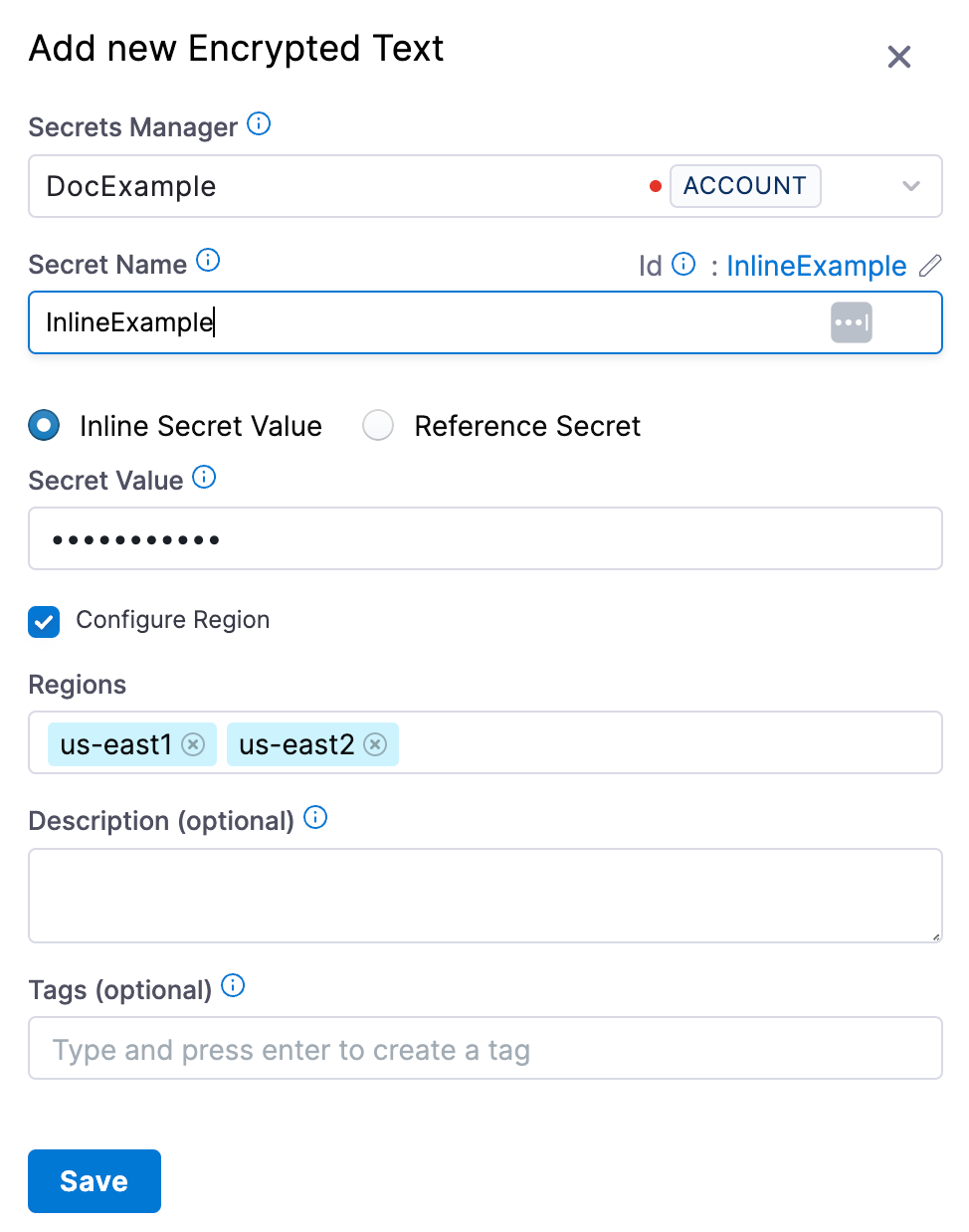 • When creating or referencing secrets (inline text, reference, or encrypted file), you can optionally specify a Project field.