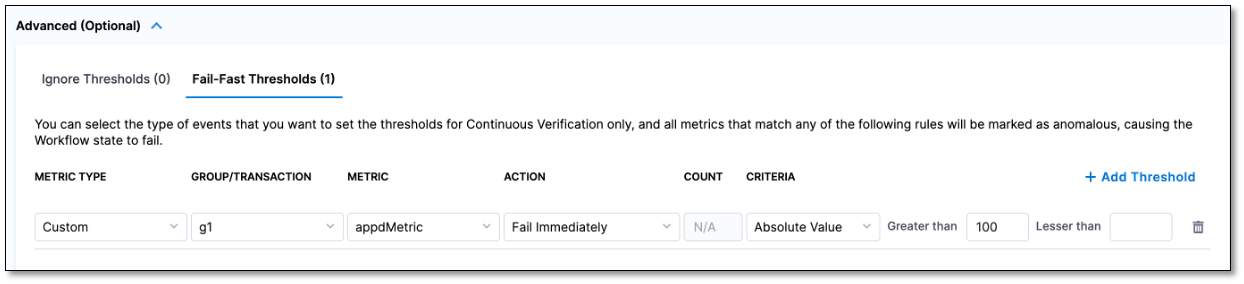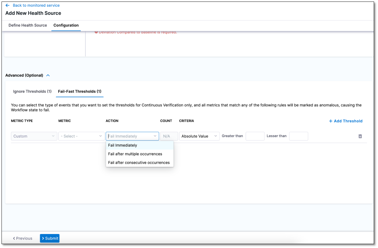 2. Go to the Fail-Fast Thresholds tab and select + Add Threshold.