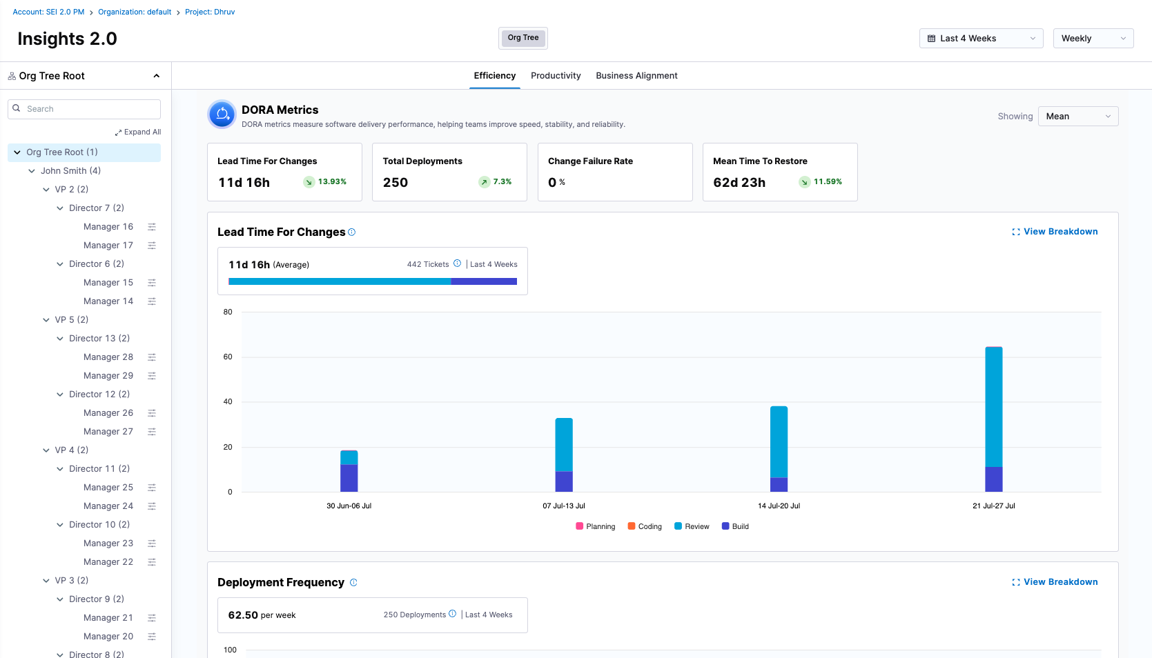 EfficiencyDelivery performance (DORA metrics) & sprint insightsDeployment Frequency, Lead Time for Changes, Change Failure Rate, MTTR