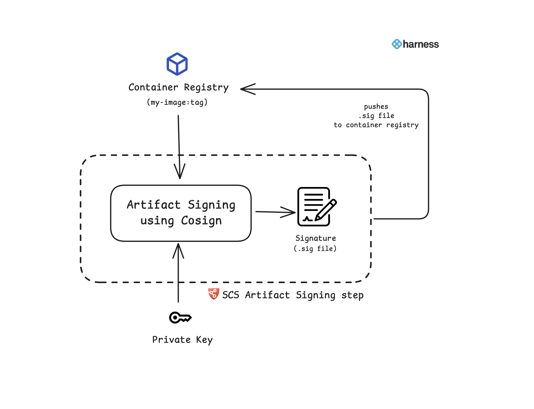 For signing container images, the Artifact Signing step retrieves the artifact from the container registry, signs it using Cosign with a private key from a key pair, and generates a signature file .sig. Once the signature is successfully generated, it is pushed back to the same container registry alongside the artifact. This signature file is essential for verifying the artifact's integrity and authenticity. For more details on artifact verification, refer to the Artifact Verification documentation