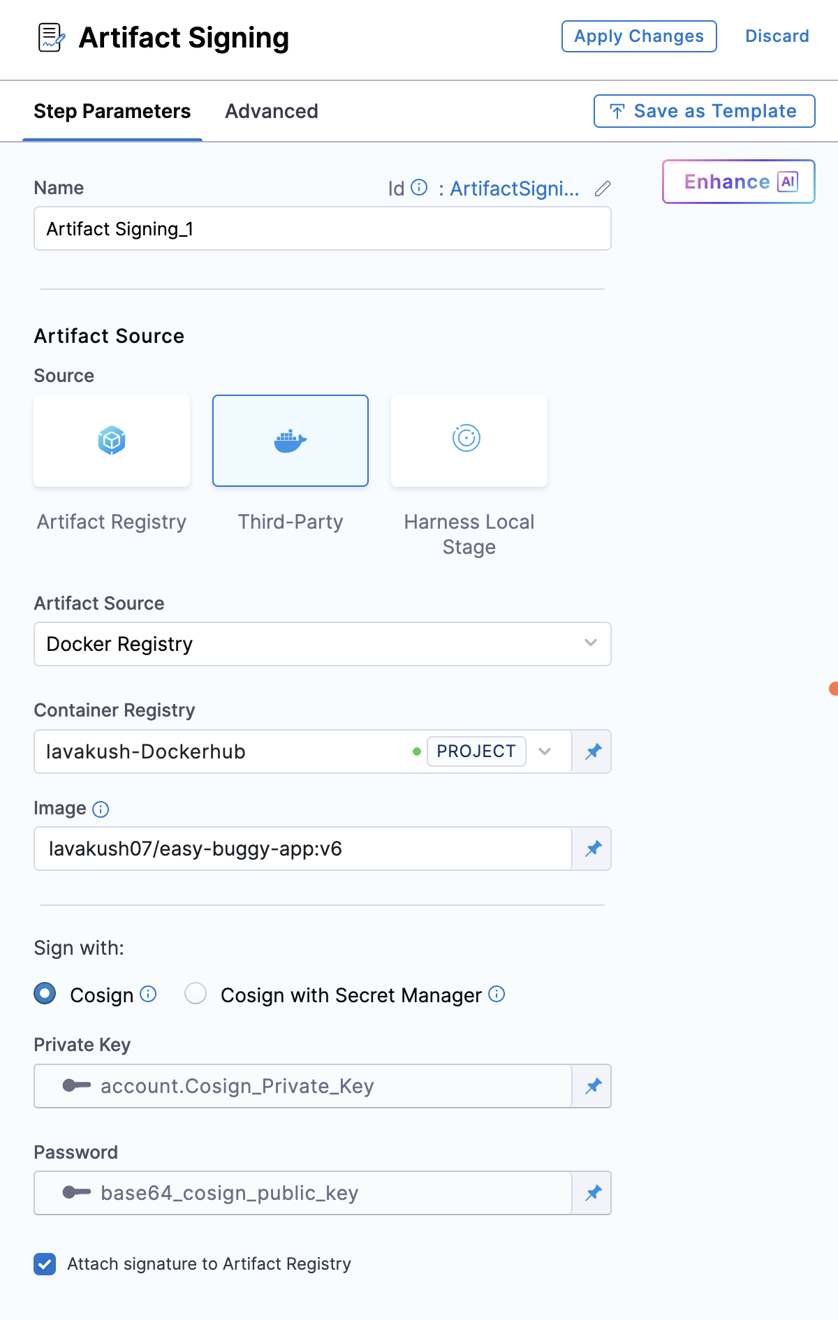 Attach Signature to Artifact Registry (Optional): By default, this option is unchecked which means the signature will not be uploaded to the artifact registry and checking this option will push the signature as a .sig file to the artifact registry.