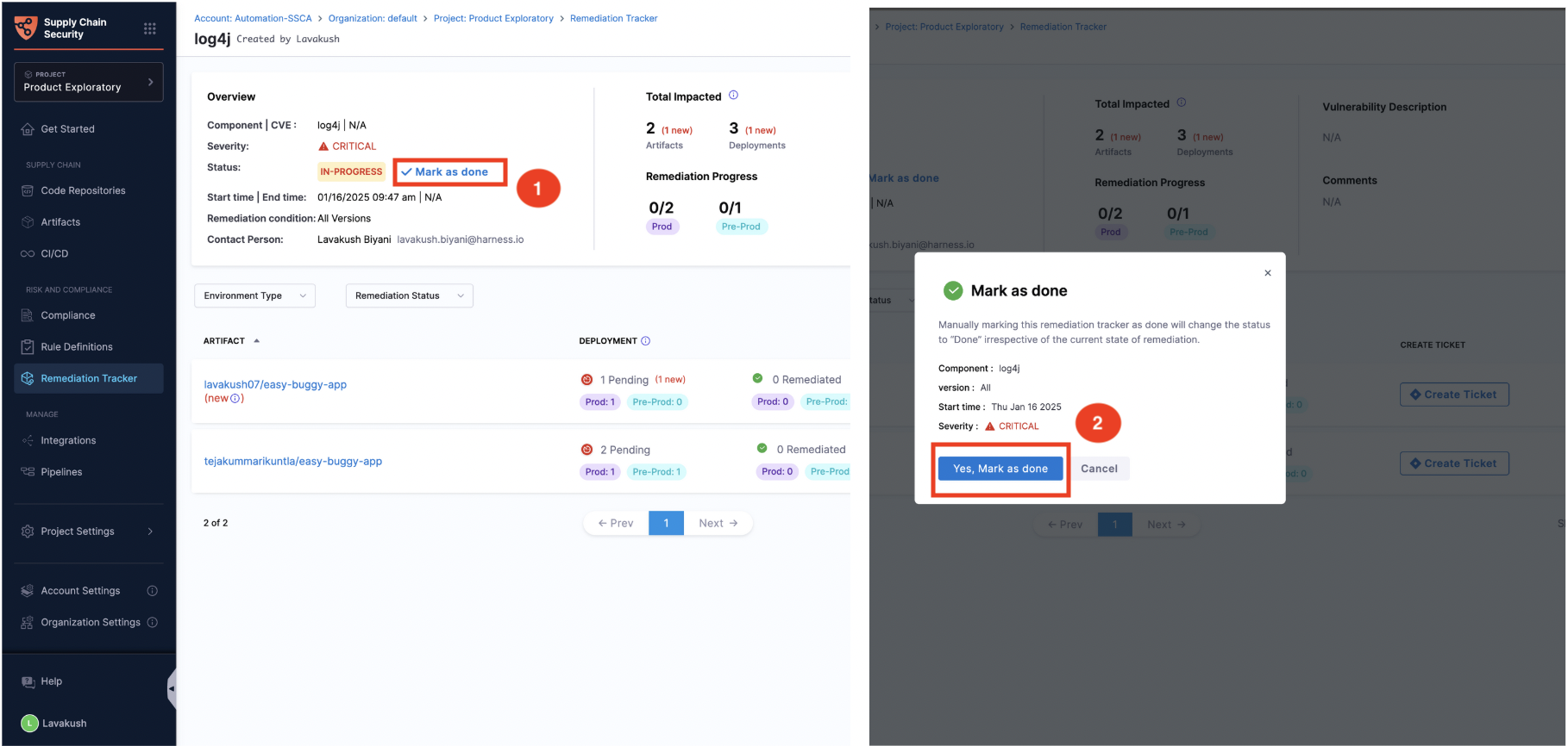As outlined in the initial section of this document, your remediation tracker will automatically reach completion once all artifacts are successfully patched, at which point the status of the tracker is automatically set to 'Done.' Additionally, the tracker provides the option to manually close it by clicking on the 'Mark as done' button found in the overview section. While manual closure is possible, it is recommended to allow the tracker to close automatically, ensuring that all artifacts are remediated.