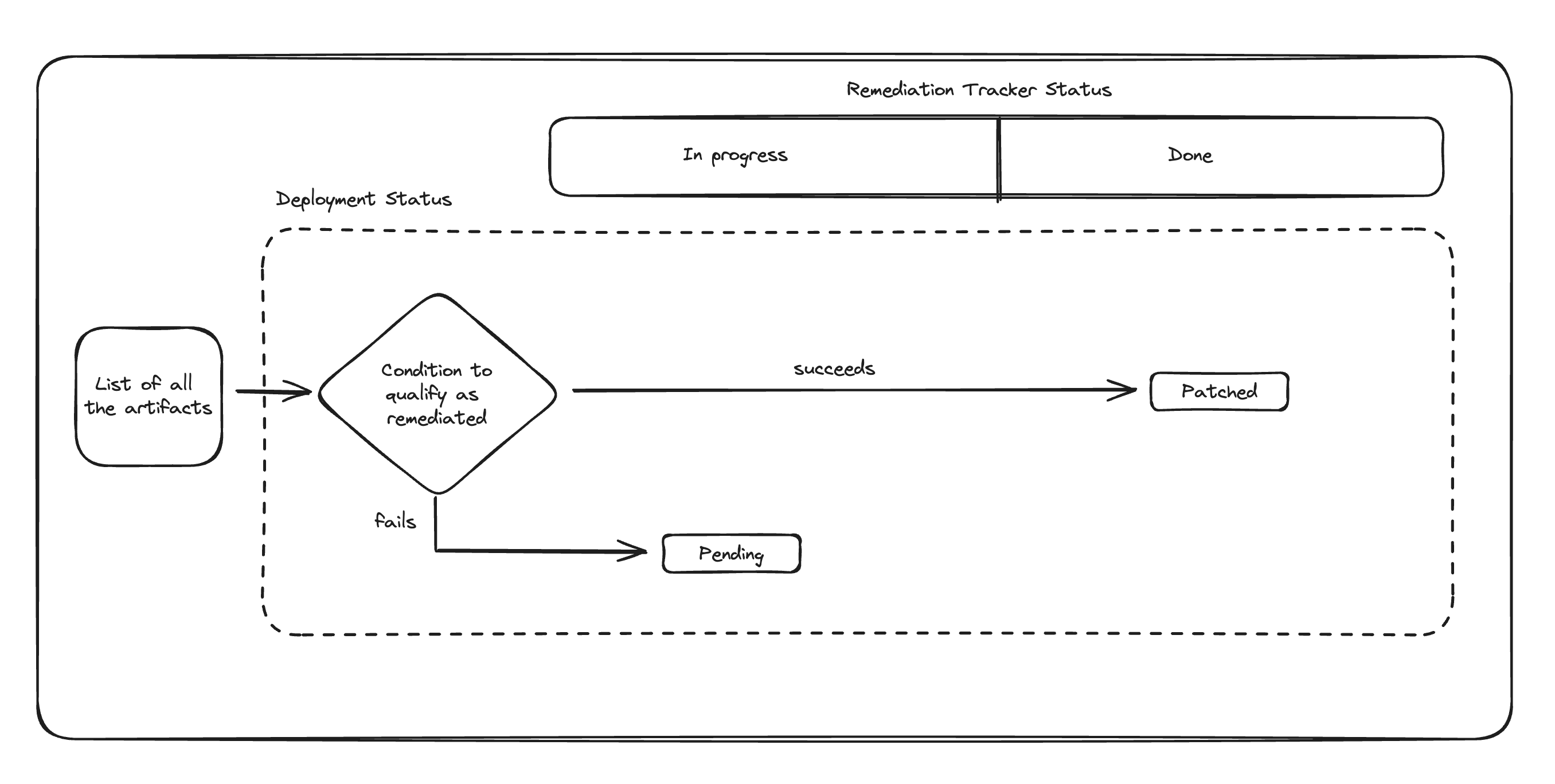 The remediation tracker operates with two stages: 'In-progress' and 'Done'. Upon creation, when the tracker identifies affected artifacts and their deployments, it sets its status to 'In-progress.' The update of the tracker's status is contingent on the deployment status of all artifacts within the tracker. When every deployment related to these artifacts is patched, resulting in zero pending deployments, the tracker's status will automatically change to 'Done'.